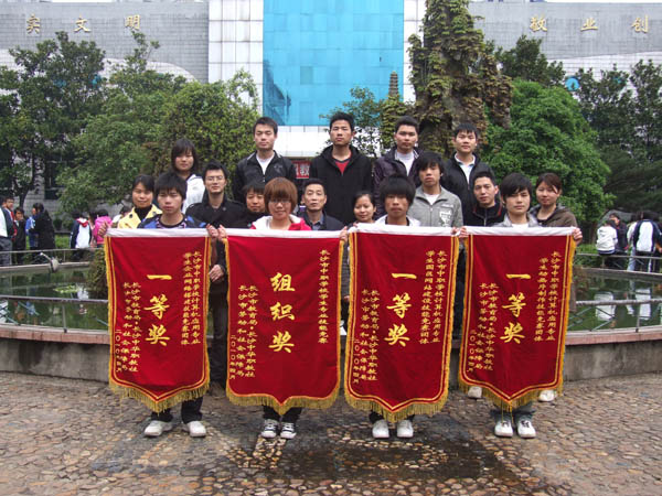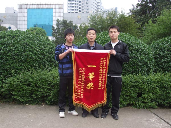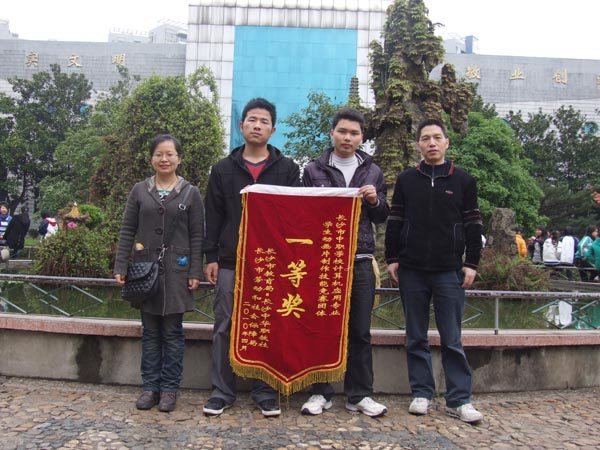我校获得三个一等奖的第一名(左起第二、三🏈、四个分别为我校唐卓🧛🏿‍♀️、李科、宋庆宪老师在领奖)