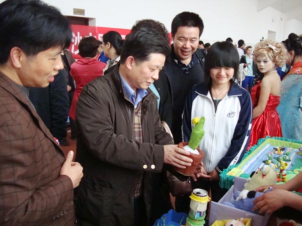 市教育局彭新局长高度称赞我校幼师班学生的手工作品