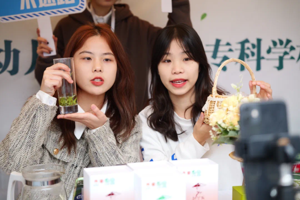 从手举牌、商品陈列,到直播环节与话术全是三位新晋“00”后学生主播精心设计,历经4小时直播,学生主播轮番上阵,共推介14款特色茶叶、农副产品销售🤷🏿‍♀️,用扎实专业的直播功底,鼎力合作的团队力量🦘,直播间获得诸多粉丝在线点赞。