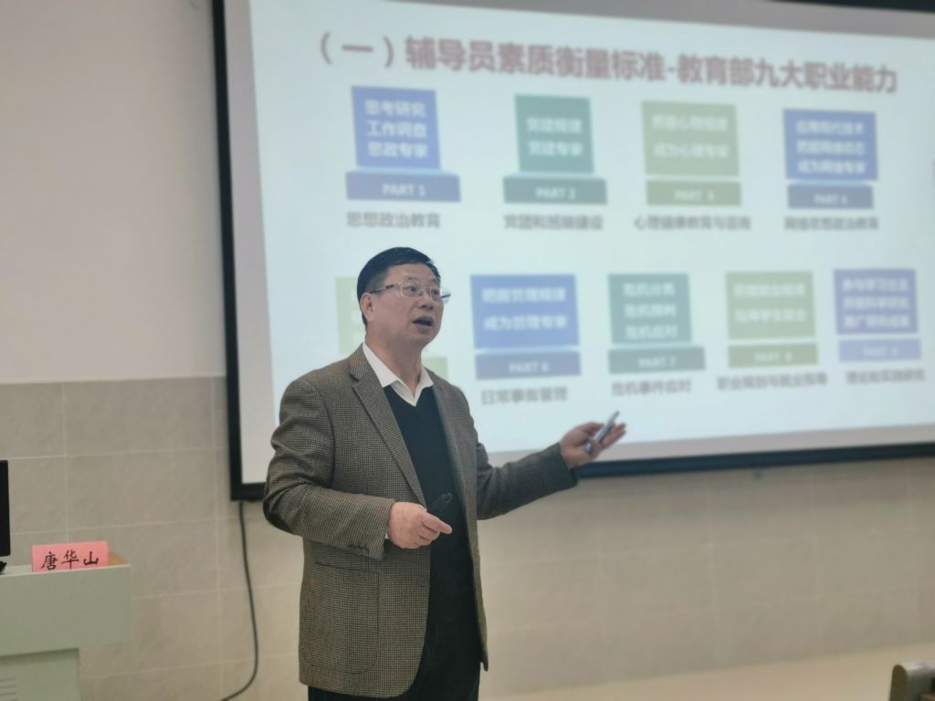 为进一步加强我校辅导员队伍建设,提升辅导员工作能力和业务水平,促进辅导员职业化、专业化发展🥡,提高学生工作管理与服务质量👳🏻,3月28日下午👨👨👧👦🙅🏻♂️,我校在德馨楼122教室举办2023年辅导员素质能力提升系列专题讲座,湖南科技学院思想政治工作研究所所长唐华山教授应邀讲课。我校副校长周文华出席讲座,学生工作与安全保卫处🙏🏼、团委全体人员,学前教育学院、艺术学院、信息技术学院分管学生工作的副院长、学工干事、全体辅导员、班主任参加培训。讲座由学保处处长彭繁珍主持。