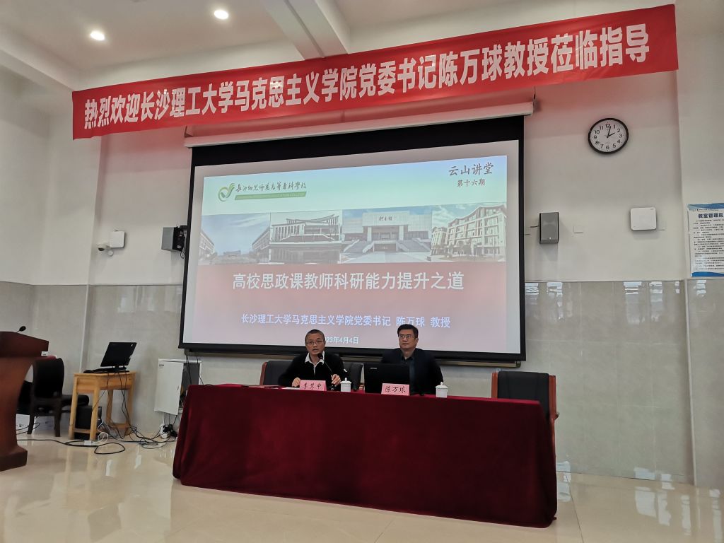 2023年4月4日下午,在长沙幼师高专人翘首以盼中迎来了学校云山讲堂第十六期暨马克思主义学院名师领航工程思政专家系列讲座第三讲“高校思政课教师科研能力提升之道”,长沙理工大学马克思主义学院党委书记、二级教授、国家社科基金重大项目首席专家、博士生导师、教授陈万球受邀讲座,全体中级及以上职称教师参加,学校党委副书记兼纪委书记李慧中主持。