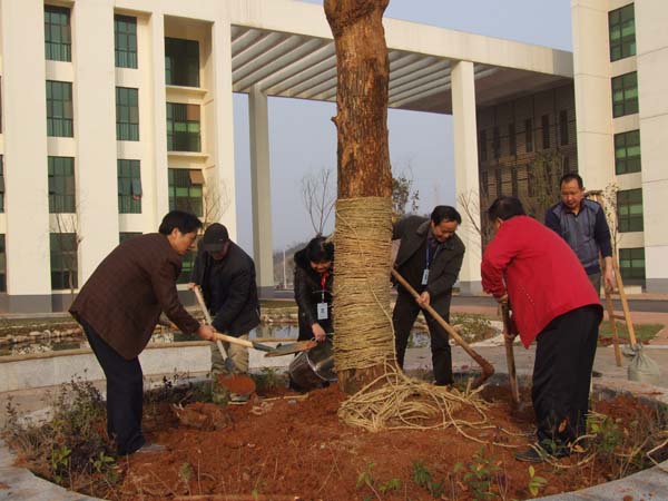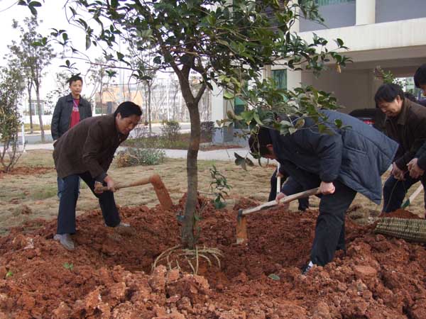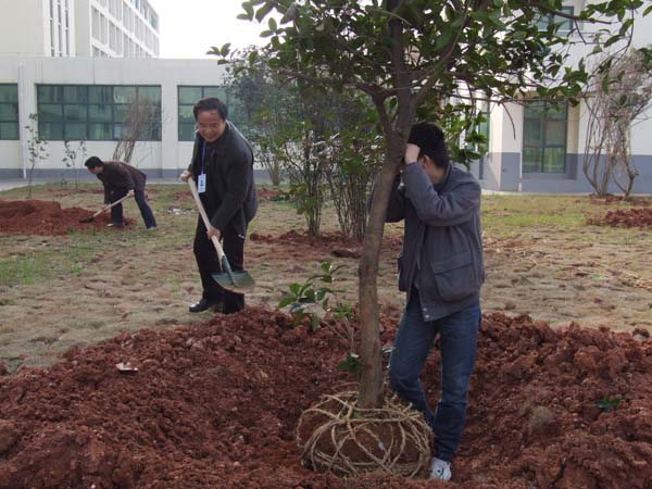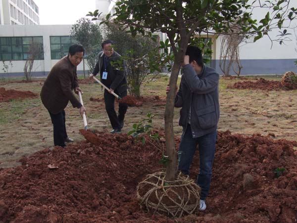 3月7日下午,当由党员捐资购买的第一车树苗运达校园后,学校党委书记左玉辉、校长郭正良🤌🏼、副校长刘余良、纪委书记李深山等校领导从繁忙的工作中抽出时间🧝‍♀️🧘‍♀️,纷纷拿起锄头、铁锹充当了义务植树员,挖坑⚰️、扶苗🙅🏼‍♂️、填土、浇水、整枝,如同一位位植树行家。尽管室外温度颇高💷,但是学校领导们的植树热情丝毫未减,全然不顾泥泞的泥土🌒,虽然额头渗出密密的汗珠,但看着自己亲手为校园增添了一份新绿😇,每个人的脸上都灿若春花👩🏼‍🦳。活动前夕学校从老校区移栽的百年罗汉松和两棵香桂树,都顺利载到了预定位置。