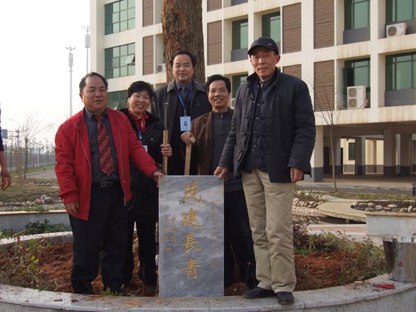 学校校长郭正良、党委书记左玉辉与老校长罗茂生、刘建勋捐栽的香樟树前合影
