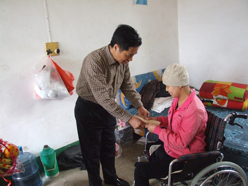 校长郭正良将慰问金送到王薇盛同学手中