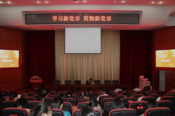 左玉辉书记从学习贯彻党章的重大意义、党章的基本内容、贯彻落实党章的基本要求等方面入手,结合学校工作实际,为全体党员讲解了学习党章的现实意义,共产党员的义务与权利,尤其是坚定共产党党员崇高信仰的问题。她指出:“人要有信仰,没有信仰的生命就没有灵魂。”“信仰指人们对某种主张或主义的高度相信和尊敬,并拿来作为自己行动的准则与指南,所以它是一种精神纽带,是一个组织或阶层、一个社会或国家的成员团结奋进的精神基础和精神动力。”她以音乐家冼星海、护理专家黎秀芳、“傻子”工人郭明义等共产党人的先进事迹为例,阐明了信仰使人的整个精神活动以它为核心,形成一个完整的精神导向,并调动各种精神因素为它服务。最后,她要求全体党员:认真贯彻落实新党章,充分发挥共产党员先锋模范作用,争创一流业绩,争当优秀共产党员。