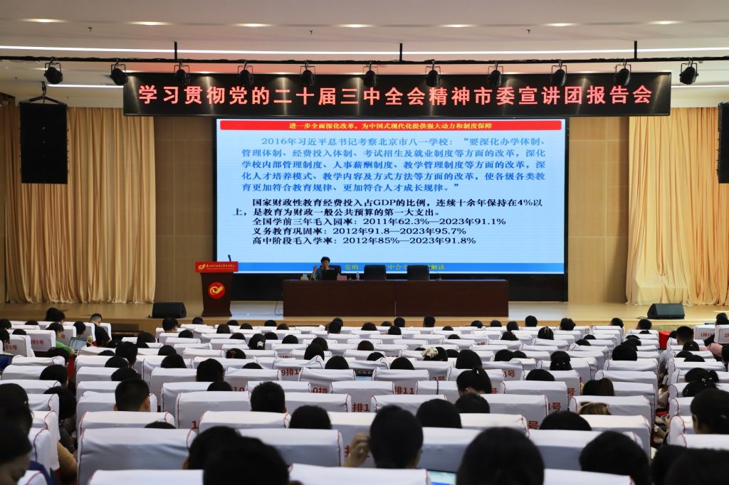 根据市委统一安排🪐,9月3日,市委宣讲团成员市委党校(市行政学院)政治和法律教研部主任教授张凯兰在图书馆报告厅为我校开展党的二十届三中全会精神宣讲。在校校领导及全体教职工近400人参加,党委委员👮🏻♂️,副校长周文华主持🧖🏼🎅🏿。
