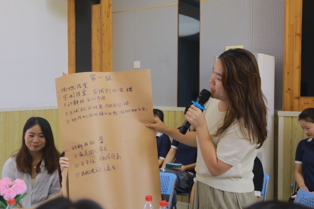 开福区教育局山语城幼儿园园长黎巾辉作为学员代表分享了返岗实践阶段开展自主游戏的基本情况。参加线下活动的学员深入户外游戏场地🤵🏻♀️🍷,分三组分别从“户外场地设置及材料投放🧜🏿、户外活动中幼儿游戏和教师支持、户外游戏活动推进情况的日常资料”三方面进行观察与记录。随后基于观察要点汇总、反馈情况,并现场研讨解决策略🚴🏽♀️、分享研讨成果。