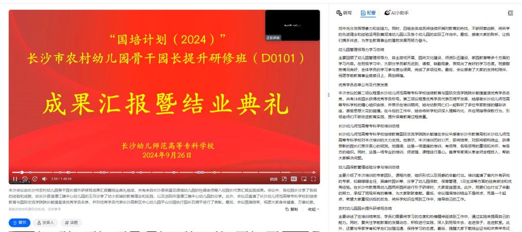 26日,研修班成果汇报暨结业典礼采取线上形式召开。长沙县湘龙街道荣盛花语城幼儿园骆娟、浏阳市澄潭江镇中心幼儿园易海英、长沙市望城区靖港镇三合幼儿园姚思、浏阳市黄泥湾幼儿园陈双作为学员代表汇报返岗实践成果🕛。班长宁乡玉潭兆基璟宸府幼儿园文江南总结学员出勤、课堂互动、任务完成等情况,全面展现了学员们学习期间的成长与蜕变。同时,研修过程中表现突出的学员被授予“优秀学员”称号,高新区中心幼儿园坪山幼儿园石湘平作为优秀学员代表发言。项目负责人长沙幼师高专继续教育与国际交流学院院长闵捷对学员的辛勤付出与研修成果表示高度肯定🧏🏿♀️,并寄语学员要在未来的工作中将理论和实践紧密结合。