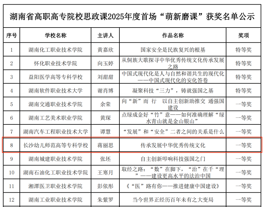 近日,湖南省高职高专院校思政课2025年度首场“萌新磨课”获奖名单公示,我校马克思主义学院“萌新”蒋丽思老师荣获省级一等奖。