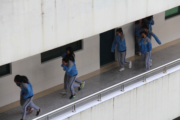 第二节课刚刚结束,随着一阵一阵刺耳的警报声在校园的每一个角落里响起,宁静的校园顿时被一阵阵纷乱的脚步声打破了。只见教学楼的每一扇门、每一个楼梯出口,都是在老师的带领下排着队伍有序奔跑的学生。不过是短短的一两分钟,全校两千多名学生就安全有序地撤离到了中央旗杆处𓀍。