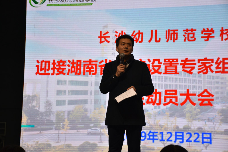 2019年12月22日下午7:40,长沙幼儿师范学校全体学生在汇美馆隆重召开迎接湖南省高校设置专家组实地考察动员大会。校长助理兼学生科科长刘建乐代表学校作动员报告。