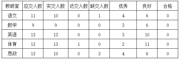 (1)本次检查较上次(期中)有很大进步🦝,按时上交并都足量,部分老师的备课节数比较多并且是跨头,如数学教研室黄武120节👱🏿♂️、彭跃明82节、钟宇亮47节;英语教研室肖琼130节、夏云60节👩🏻🍼、张婕51节🧑🏻🦳,思政教研室田伟62节🧯、文小交和闾衣32节🤲🏿;