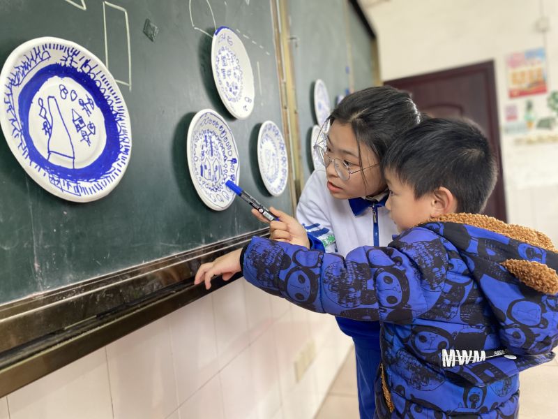 针对帮扶幼儿园环境创设这一薄弱区域,党员教师按照《幼儿园教育指导纲要》的要求🏌🏽,带领学生志愿者精心设计、布局上墙,为帮扶园中班呈现了凸显传统文化元素与色彩的青花瓷主题墙面环境创设。