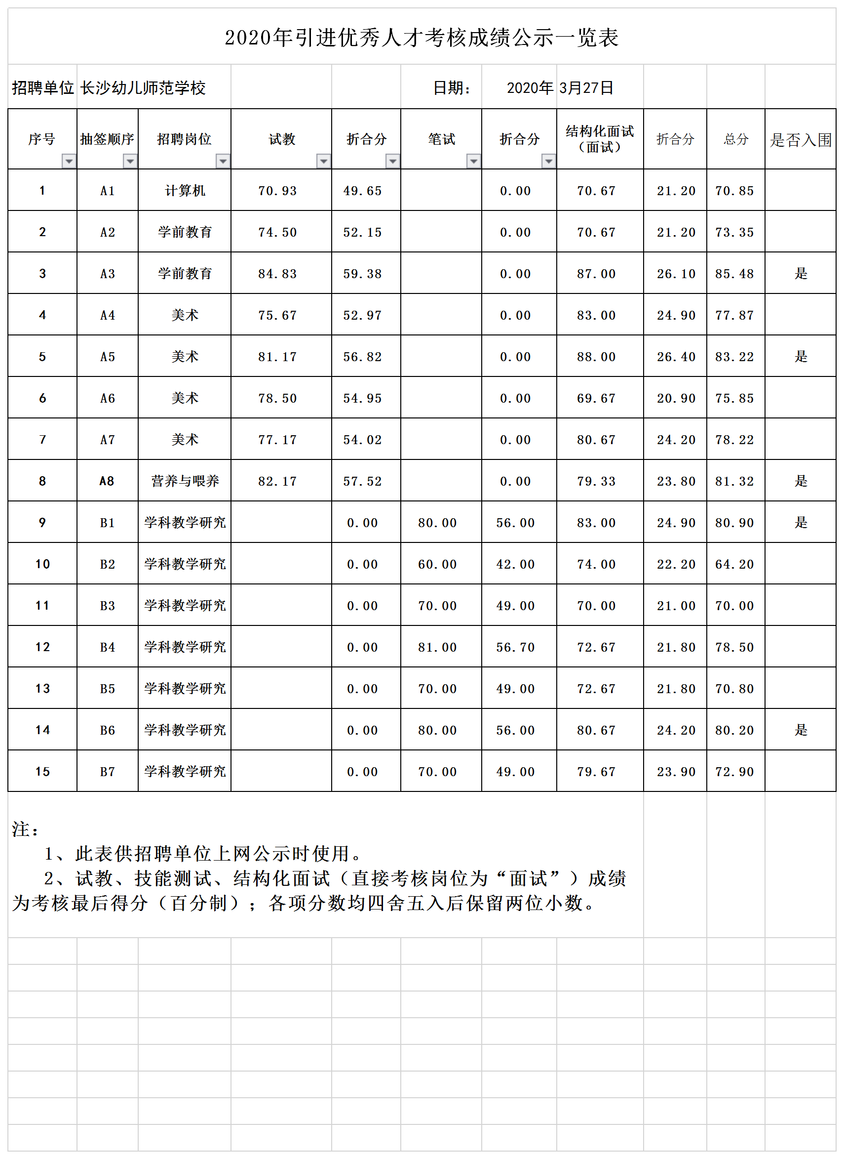 2020年引进优秀人才考核成绩公示一览表