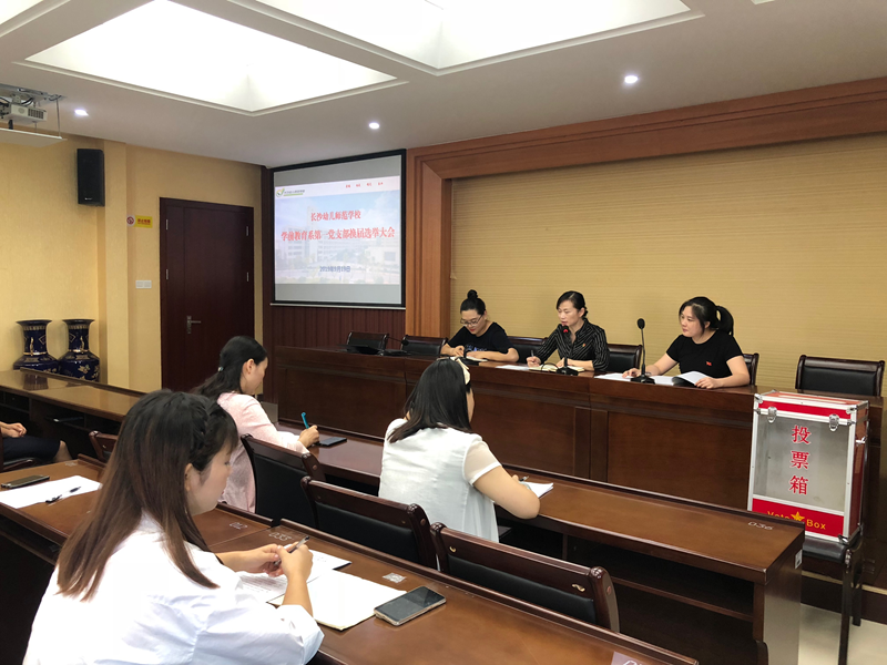 2019年9月19日12点40分,长沙幼儿师范学校学前一支部在道馨楼宁觉厅召开支部委员会换届选举大会,学前一支部全体党员佩戴党徽参加了会议。