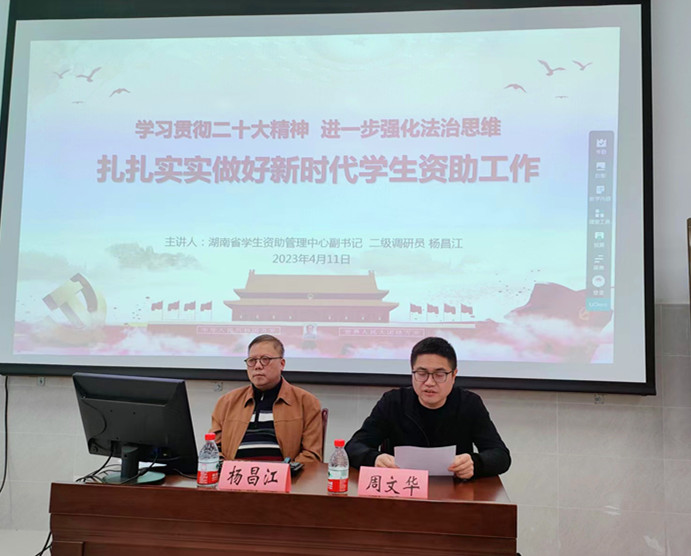 4月11日下午,湖南省学生资助管理中心副书记杨昌江一行5人应邀至我校进行题为“学习贯彻二十大精神 进一步强化法治思维 切实做好新时代学生资助工作”专题讲座,并围绕学生资助工作开展专项调研。学保处及二级学院领导、干事、专兼职辅导员聆听了讲座,副校长周文华主持讲座并陪同调研。