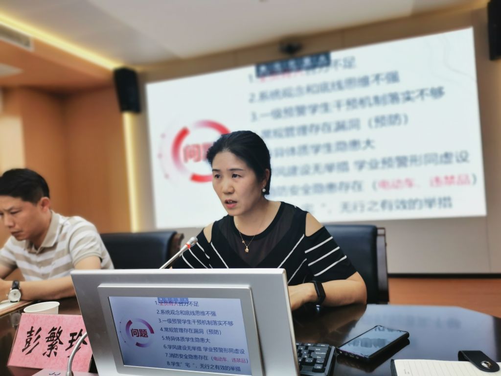 学保处处长彭繁珍以“做学生工作引路人,扣好人生第一粒扣子”为主题🩸,就学生工作情况进行总结复盘、规划部署🍢,重点将2022年搬迁到新校区以来学生日常管理工作中的应急突发事件等六类情况,按学院☝🏻、时间节点分类进行了数据分析和总结。同时提出了学生工作存在的困难和问题🏭,要求大家做到全员“四进”,推动重心下移👩🔬;引导学生“四出”,促进健康成长👳🏻;落实安全教育、确保校园平安稳定。
