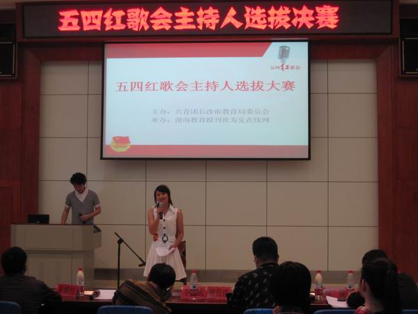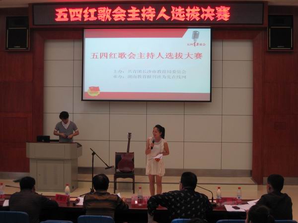 2011年4月25日下午,长沙市信息技术学校组队参加长沙市教育局举办的“五四红歌会”主持人选拔赛🚣🏿🧑‍🌾,在预赛中胜出的李丹🥬🤯、廖向阳两位同学参加了此次比赛,并与来自长沙市其他学校的34名选手进行角逐。