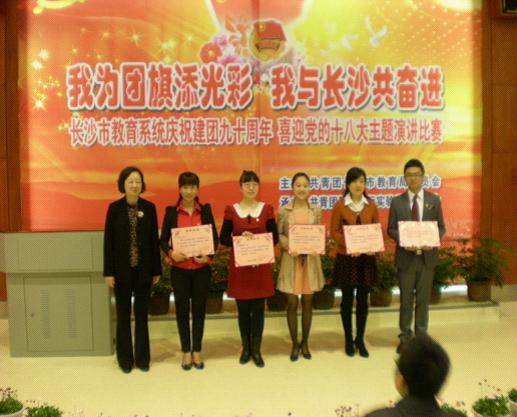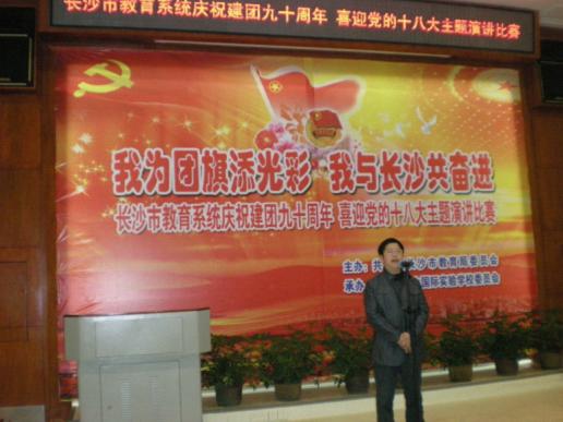今年是中国共产主义青年团建团90周年。为隆重庆祝建团90周年,进一步深化创先争优活动,积极引导广大团员青年投身长沙经济建设和社会发展实践,为长沙推进“五化一率先”贡献智慧和力量,以良好的精神风貌和优异的成绩迎接党的十八大召开,共青团长沙市教育局委员会在麓山国际实验学校会议厅举办“长沙市教育系统庆祝建团九十周年喜迎党的十八大”主题演讲比赛。