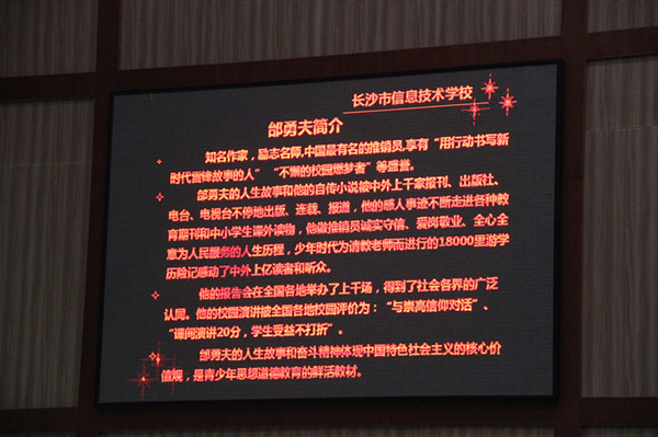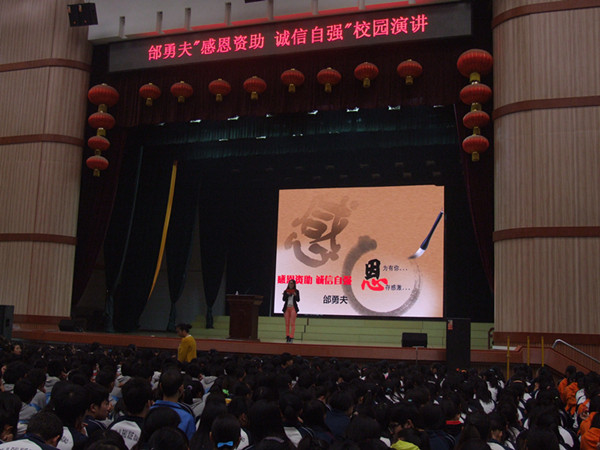 为了让我校学生懂得感恩,学会感恩,自强自立,自尊自信,2013年10月30日下午3点,我校全体师生齐聚汇美馆,参加由知名作家,励志名师,中国最有名的推销员邰勇夫带来的“感恩资助、诚信自强”校园演讲活动,学生科负责免学费和助学金工作的黄丽辉老师主持了本次活动。