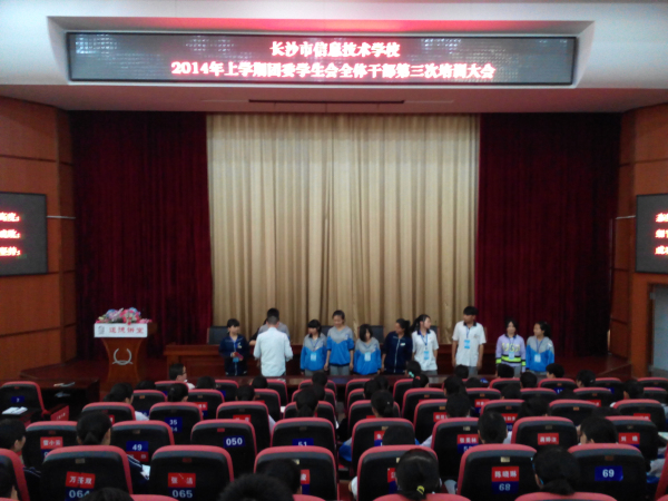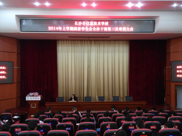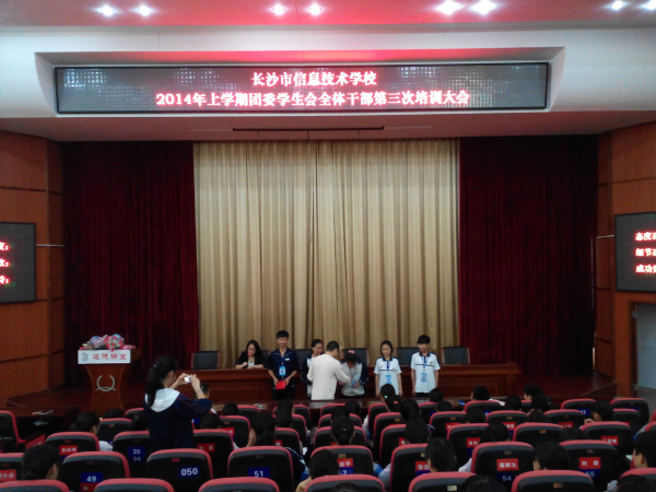 5月8中午12:50,校团委学生会第三次培训大会在学生科的精心准备下如期举行。参加本次培训大会的有校长助理兼学生科科长周文华,校团委副书记兼学生科副科长周曦,学生科银伶老师,彭亮老师及全体校团委学生会干部,大会由银伶老师主持。