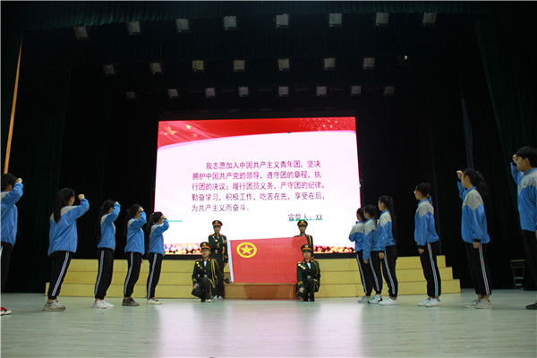 随着主讲人宣布进行入团仪式🦻🏻,新团员代表合着团歌的节奏踏上汇美馆的舞台,学生科银伶老师庄重的为他们佩戴上金灿灿的团徽,她们庄严的将右手举过肩高⬜️,跟着团委学生会黄薇的领誓,严肃地宣誓🧗♀️。从此👸,团组织又多了一批新鲜的血液,这批新团员也得肩负起为共产主义奋斗的使命。