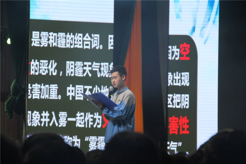 王桢佑同学说随着工业化进程的深入,人类对环境问题越来越重视,水污染、垃圾污染、空气污染等问题在人们眼前浮现。他就大气污染中较为凸显的“雾霾”现象进行了说明,他提醒同学们有雾霾时带口罩出行⛹🏼♀️,以免吸入有害气体伤害身体。