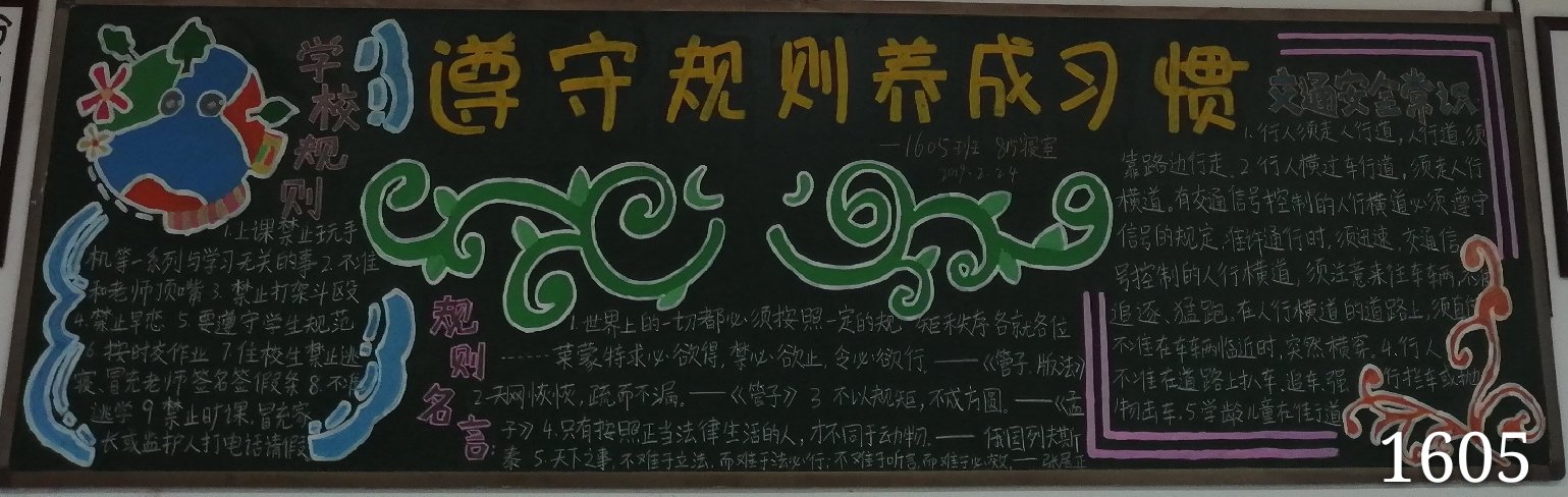 此次黑板报活动开展的很顺利,此次黑板报活动也告诉我们遵规守纪🚰,让我们的学习有条不紊地进行,让我们的社会和谐有序的进行,让我们学会礼貌的待人接物,让我们与同学友好相处,互帮互助,让我们与老师彼此尊重,对于一所学校,遵规守纪也起着不可小视的作用,人我们一起“遵守规则👧🏿,养成习惯”。
