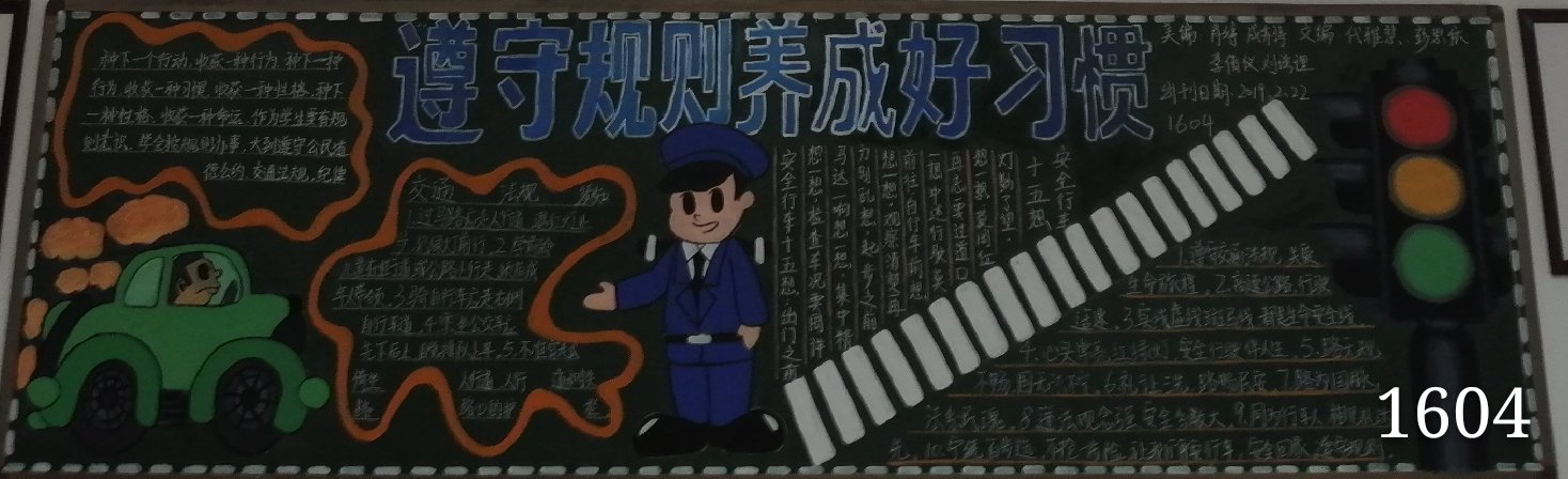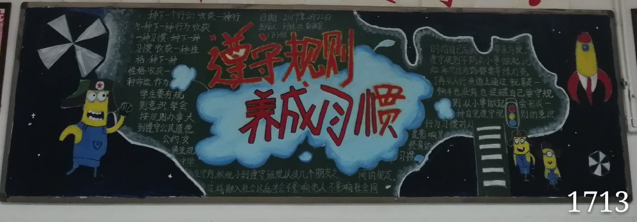 如果火车没有受轨道的约束,就会倾覆;飞机没有受航线的约束,就会坠落;生活处处需要规则,也需要人们遵守规则,这样生活才会有秩序,而不是乱成一锅粥🏎。因此🧜🏽🕎,我们绘制了以“遵守规则,养成习惯”为主题的黑板报🤵🏻。