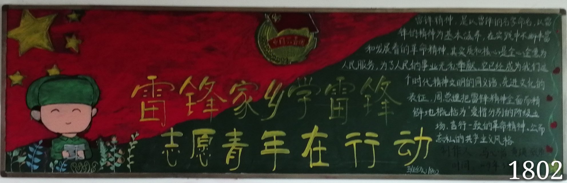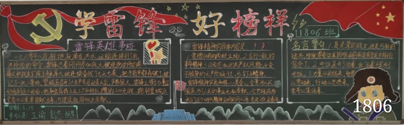 在黑板报评选中,1802班运用了红,黄,绿三种颜料,绘制了国旗🖖🏼、团徽以及雷锋等形象🦧,充分体现了本次的板报主题,吸引了不少同学注意。1815班通过绘制雷锋形象💂🏽♂️,并且运用不同颜色的粉笔补充了雷锋的生平事迹。而在三等奖的班级中,1803班也别出心裁,虽是用粉笔绘制,但也给人一种很干净的感觉。1804班也运用了水粉颜料绘制了蓝天白云,写下了要想雷锋学习的决心👨🏼🏭。做的好的班级还有很多,都有各自的闪光点,相信在以后做的日子里,18届的同学们一定会更加出色!加油!