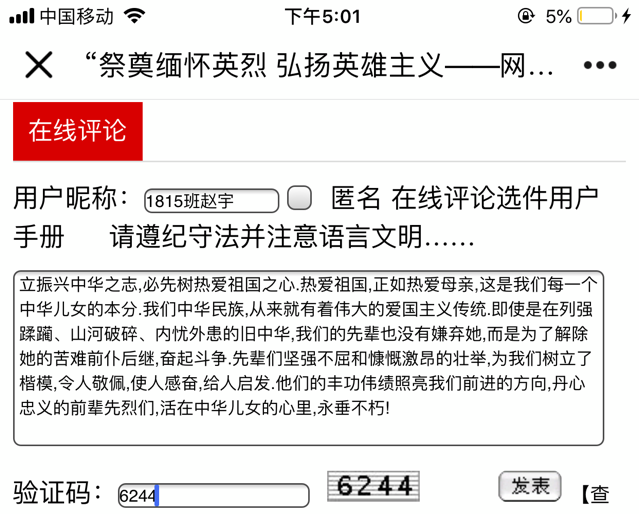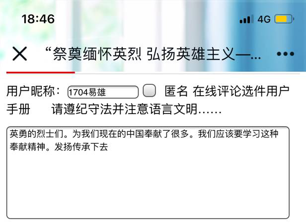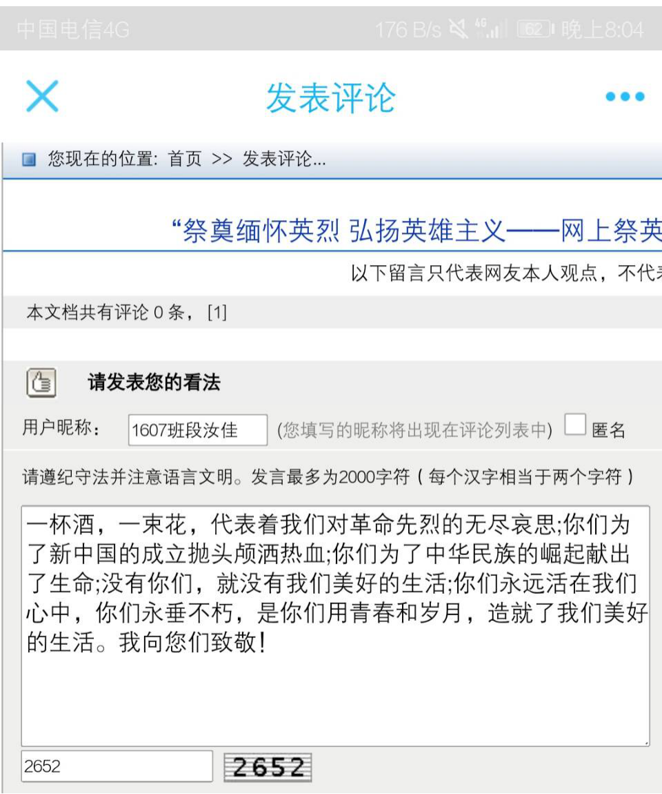 活动负责人1802孙文君组织全校师生登录中国文明网参与“传承英烈精神立志报效祖国——网上祭英烈”网络文明传播活动,学校近2000名师生在网上寄语留言,表达对革命先烈的感恩怀念和景仰之情🧛‍♂️。借此机会,利用课余时间🤍,学生在中国文明网上点击相关信息,了解英烈革命事迹,学习英烈爱国精神,向英烈献花🧜🏽‍♀️、留言⏯,表达缅怀之情🤽🏿‍♀️。 1702班卢如靓雪在留言中说道🅰️👨🏿‍💼,一个民族光荣的振兴,离不开壮士的奉献;一个民族屈辱的洗刷,离不了烈士的身躯🧜🏼。革命烈士们,你们生的伟大🏋🏼,死的光荣!我作为祖国新时代青年,在这里向你们奉上最崇高的敬意! 1605班李晓玟留言道年年祭扫先人墓,处处有犹长春风,学习先烈革命精神,为振兴中华建功立业🧸,不忘烈士抛忠骨🖐🏻🧚🏿‍♂️,民族复兴中国梦;1804班孙文静留言道清明将至,缅怀先烈,我们现在的幸福生活是你们用生命换来的👩🏼‍🏫。珍惜当下🧚‍♀️🏊🏿‍♂️,向你们致敬!