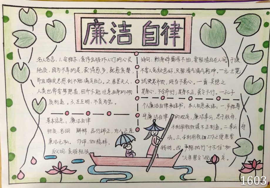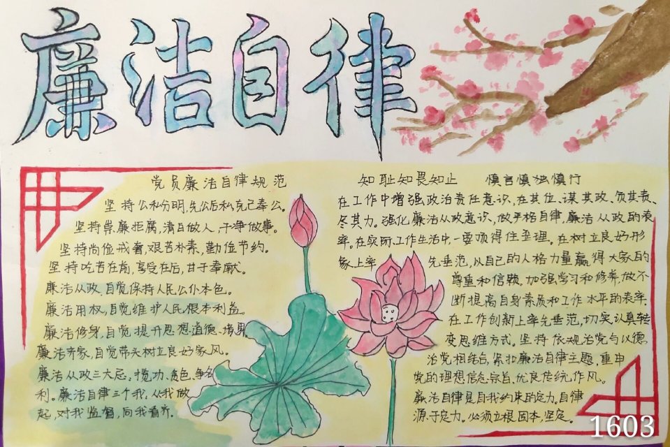 清水,无味,但是清正廉洁的象征,代表着清白和追求,涤荡着那不安的心,把人们的思想引向广阔无垠的大海,可见廉洁以及自律是多么的重要。学校为了增强学生对廉洁自律的认识,组织开展了一次以“廉洁自律从我做起 ”为主题的板报绘制活动。