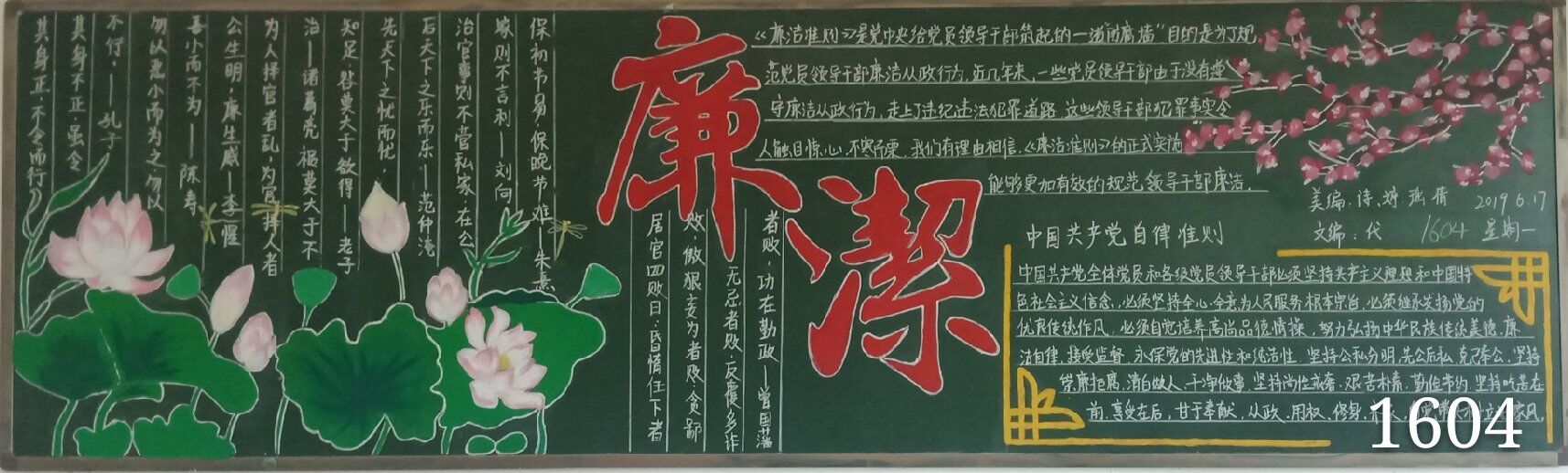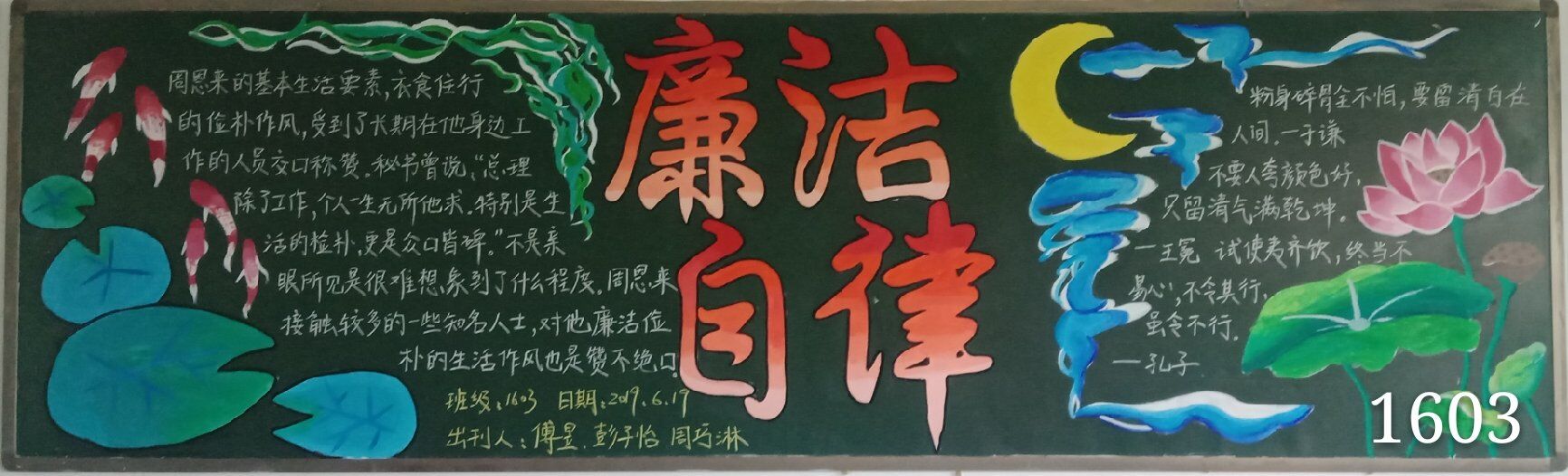 1603班绘制了荷花💛,荷叶以及锦鲤等形象,望着那粉嫩嫩的荷花,令人不由得想到。“出淤泥而不染,濯清涟而不妖”的荷花高洁精神🪁。1604班则不仅绘制了荷花,还绘制了傲然于风雪之中的梅花,“廉洁”两个大字正挥舞在中央☝️,相信1604班的同学对于廉洁这一个意识也根深蒂固了吧。1605班则在黑板中央绘制了一个大大的中国结,并且誊抄了《爱莲说》一文👘,右边还写下了自律准则等内容。使同学们对于廉洁以及自律这两个词语有了更深刻的理解🤵🏿‍♂️。