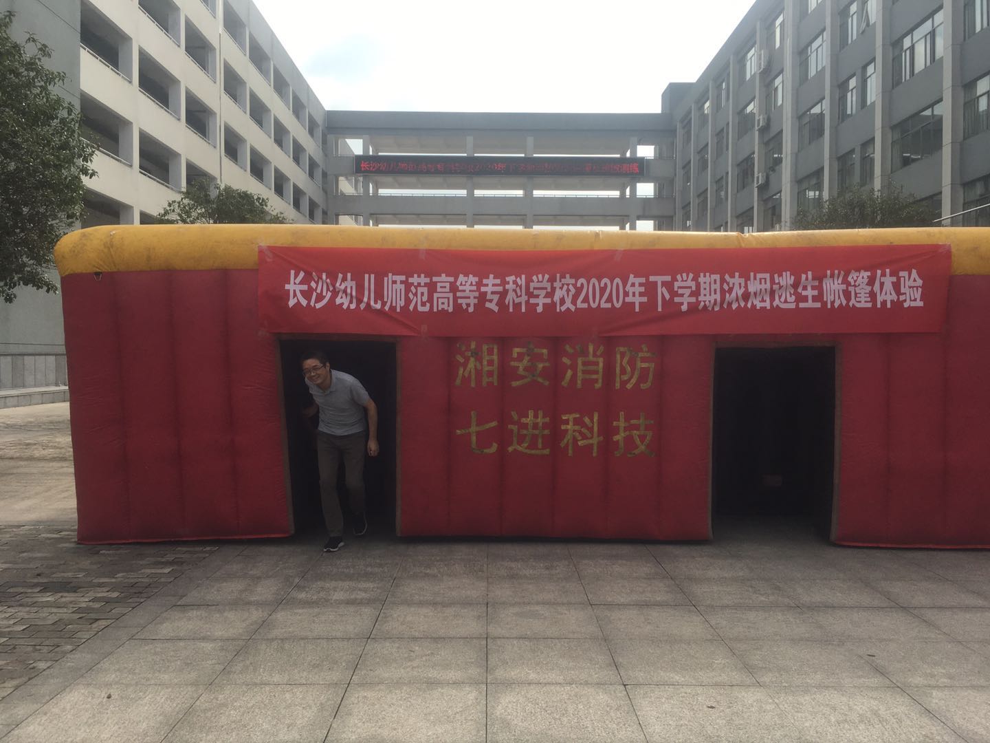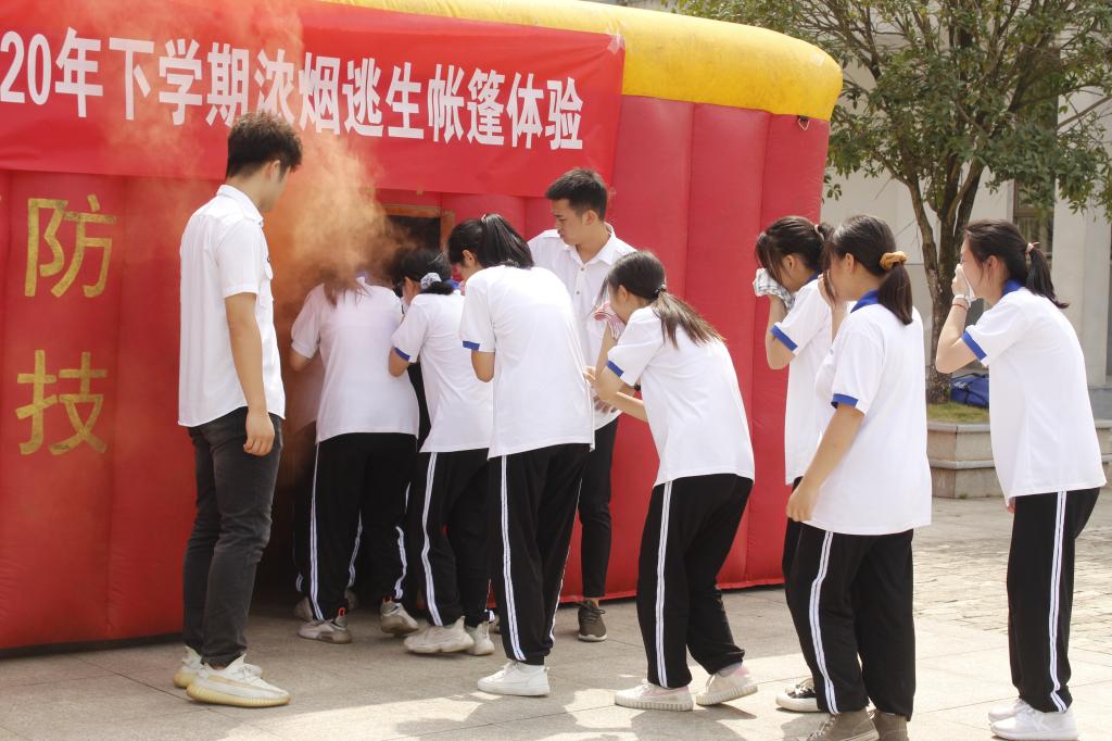 随后党委副书记兼纪委书记李慧中带领全体学生参与了浓烟逃生帐篷体验。“逃生帐篷”真实模拟火灾现场环境,伸手不见五指,浓烟滚滚,迂回曲折。通过身临其境的真实逃生演练,同学们学习并掌握了在火场中基本的逃生方法和火场避难技巧,克服了恐惧心理,提高了应急处置心理素质。