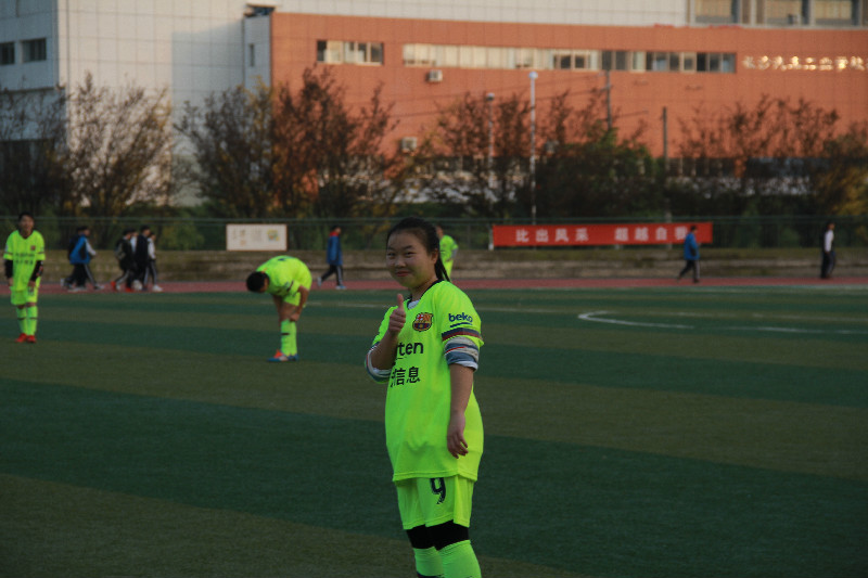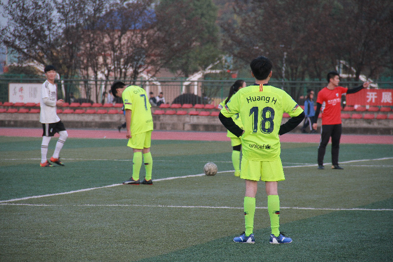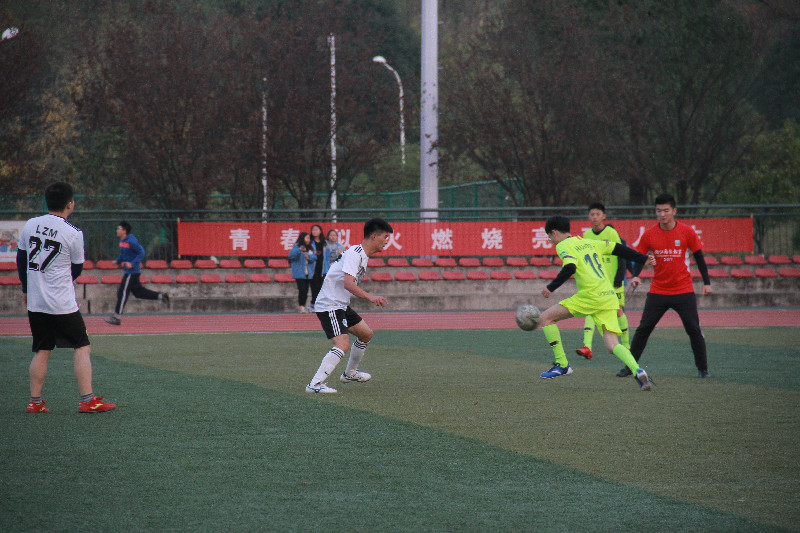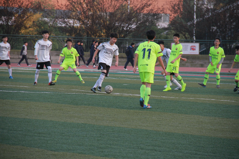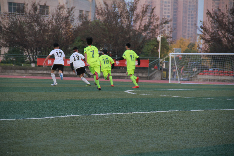 随着裁判的一声哨响,足球社的球员们迅速进入了比赛状态。两队各有攻守、大开大合,场面很是精彩,场边助威的观众也情不自禁陶醉其中。绿茵场上不论是绿色队服的信息队员还是白色球服的商贸成员,个个精神满满,他们用细腻的脚法与巧妙的配合在一个半小时的足球比赛中,精彩的场面层出不穷。