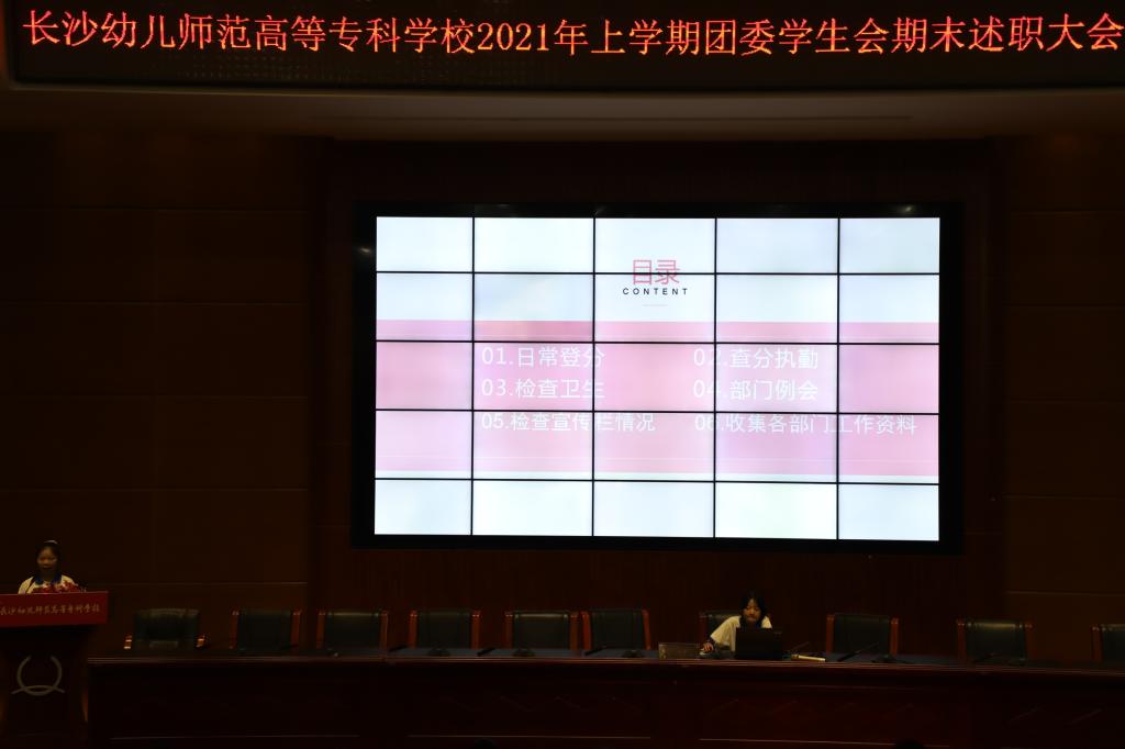 学期述职大会上,各个部门选派了1名代表进行本学期的部门述职,每个部门主要从日常工作、学生活动、工作总结、工作计划四部分进行详细汇报,并通过ppt的方式将部门的风采淋漓尽致地展现在师生的面前,展现了团委学生会求实创新相结合的工作风貌。