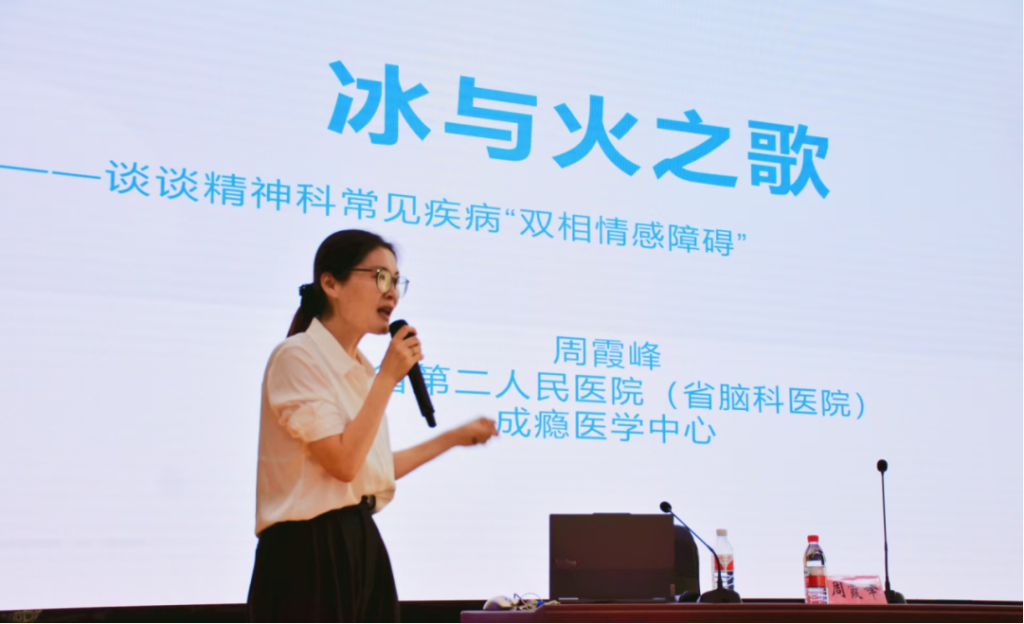 周霞峰以“冰与火”的生动比喻,深入浅出地讲解了双相情感障碍的核心特征与识别方法🦬。她重点解析了该疾病的四种发作类型(躁狂、轻躁狂、抑郁、混合发作)🧎♂️➡️,并通过真实案例和专业量表,帮助师生掌握早期识别技巧。周霞峰特别强调:“社会支持是患者康复的关键”🛩,并从专业角度提出具体建议:患者应坚持服药、定期复诊;身边人要给予理解支持、协助制定治疗计划🚣🏼♂️。讲座尾声,她暖心呼吁“用关爱为心理疾病患者点亮希望”✝️👩🏽🎓,引发全场共鸣。