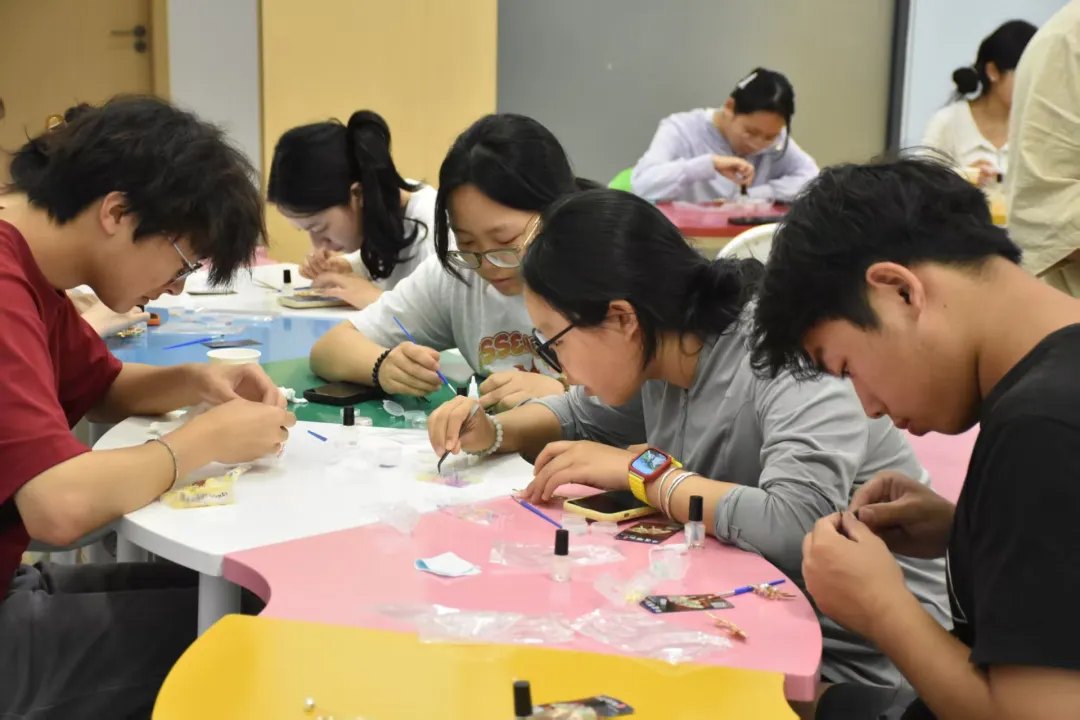 在“非遗共振”环节,活动迎来了高潮🏃🏻‍♀️。黄青详细讲解了螺钿制作的完整流程后,师生们纷纷动手实践。特别值得一提的是🪞,活动现场不仅有学生参与🧑‍🏭,更吸引了多位教师加入创作行列。师生共同挑选贝片⛹🏿‍♂️、构思图案、拼贴镶嵌☞,在传统工艺的熏陶中交流心得,拉近了彼此距离。一片片零散的贝壳碎片在巧手下渐渐成型🐧,化作精美的艺术品💎,更成为心灵沉淀的见证。