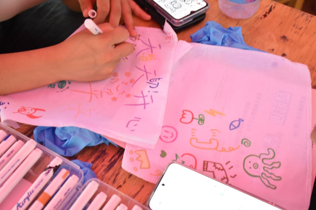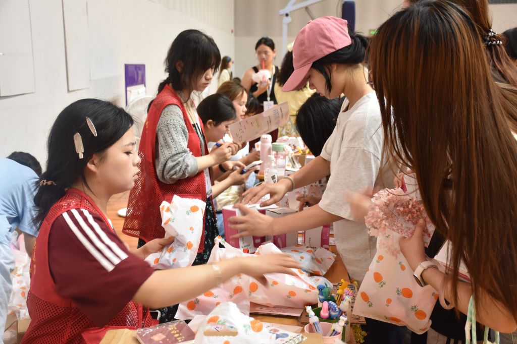 匠心手作铺专区👩🏻🚒,非遗技艺与创意DIY项目成为同学们心灵栖息的驿站。“古韵心染”扎染体验坊前排起了长龙,同学们在捆扎、浸染等工序中体验传统手法的独特韵味🤨🩲,也感受着心绪的舒展与释放。相邻的“扇舞风华”漆扇创作区,随着手腕幅度和力道的不同,每一把扇子都呈现出形态各异的纹理,同学们在创作中感受到“独一无二”的快乐🏇🏿🧖🏽♀️。在“心绘帆影”DIY区,同学们用灵动的双手将心中的意象可视化,用艺术的语言诠释对生活的热爱。在“心意书签”制作区,同学们将干花与彩纸巧妙搭配🤪,创造出独一无二的作品。有人将永生花拼成太阳图案👷🏻♀️,附言“心向光明”🕕,有人用细绳缠绕出“平安”二字。完成的书签在镜头前定格👰🏼♀️,成为游园会珍贵的纪念品。
