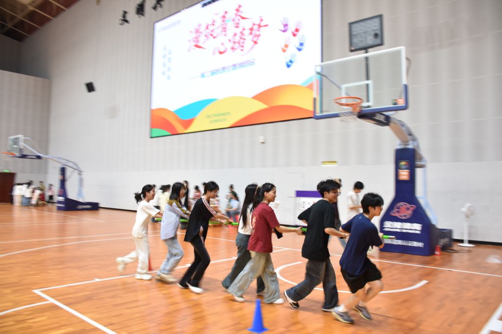 最具挑战性的“解锁心活力”专区则开设团体挑战🤦♂️,通过协作互助提升团队凝聚力,让同学们在欢乐氛围中收获友谊。在“鼓动人心”现场,大家齐心协力,喊着整齐的口号,让排球在鼓面上有节奏地跳跃💁♂️。“杆上心程”挑战区则上演着平衡与信任的协奏曲👩🍳。有人紧攥前方伙伴的衣角步步试探,有人在摇摇晃晃中爆发笑声🧚🏼,最终所有队伍都在相互搀扶中抵达终点,诠释着“盲区亦有光”的深刻寓意👨🏿🚒。“珠行万里”挑战现场,30米长的赛道上🌄,半圆管如波浪般传递😶。有队伍因球体掉落集体叹息,随即调整策略加速奔跑⚖️;有队伍默契配合🕟,球体稳稳落入终点杯子时,队员们击掌相拥📩,无论成败,每个人的脸上都洋溢着酣畅淋漓的喜悦。而在体育馆的一角👬,“环环心扣”项目中,学生们手拉手围成圈,将呼啦圈从一人手中传递到另一人手中,过程中大家相互配合,笑声连连,增进了彼此之间的信任与默契。
