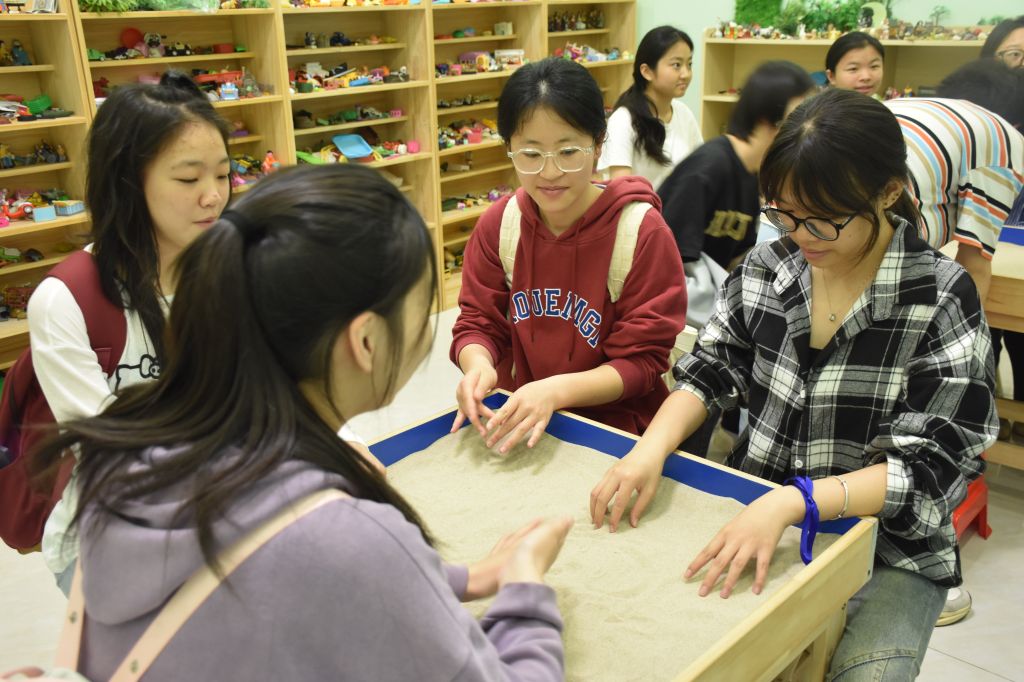 讲座结束后,同学们意犹未尽,纷纷报名参加现场沙盘体验🅰️。在心理中心的沙盘室,许新赞带领30名参与者分组进行实践🂠⚜️。在舒缓的音乐中,大家分组围坐,指尖轻抚细沙,开始自由创作🧑🦰。有人堆砌山峦象征压力,有人摆放小船代表漂泊🙆🏻♂️,还有人在沙盘中央挖出“心形湖泊”。沙盘瞬间成为承载集体情感的艺术品🦵🏽💁♀️。体验结束时📙,许多同学仍不舍离开,围着许新赞请教沙盘解读技巧。