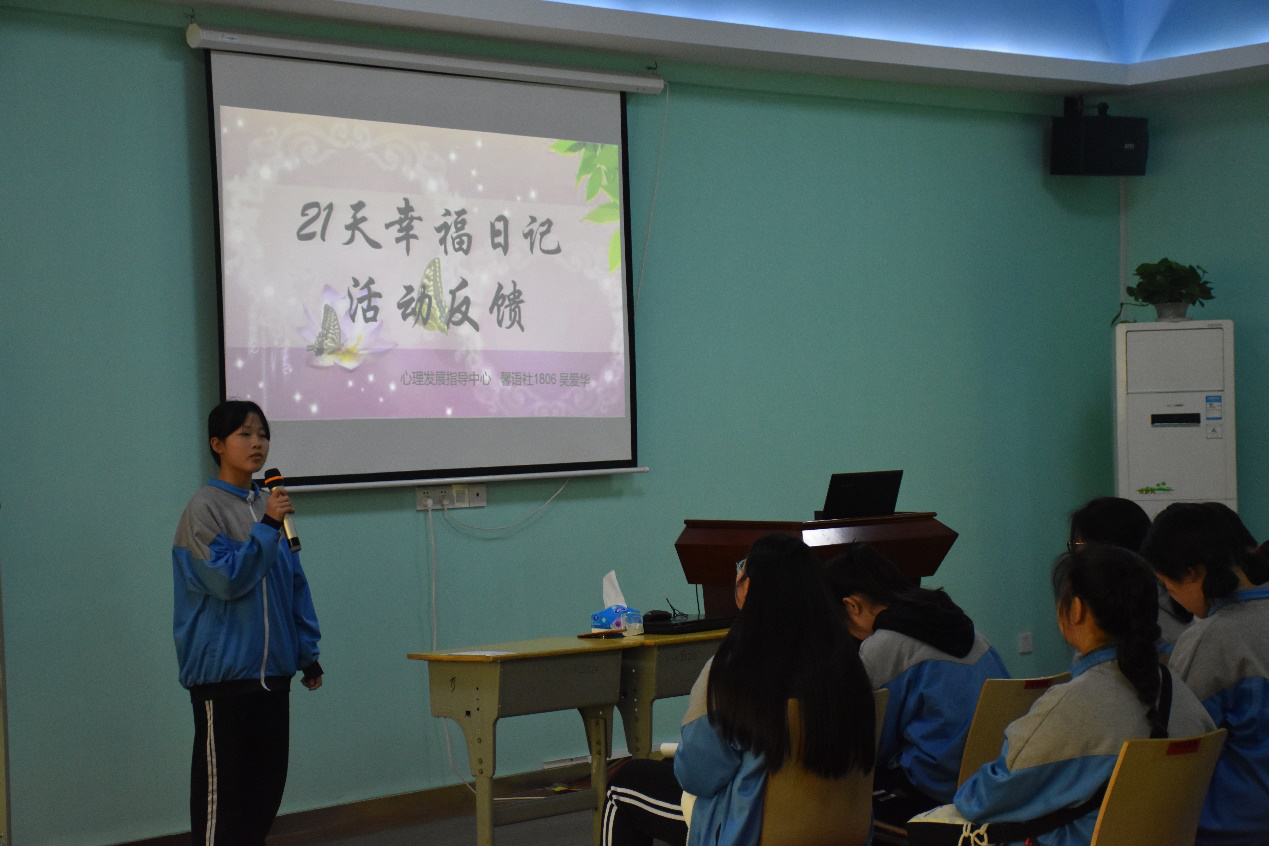 首先👏🏻👨‍❤️‍👨,由吴爱华总结21天幸福日记活动🏒👩🏿‍🏫。在挑战情况和优秀日记展示中,我们看到了大部分心委认真参与活动的剪影。在活动参与代表发言中,1604罗梦涵分享到 “21天的挑战活动渐渐地让我成为了一个善于发现身边幸福的人”,1806易燕雨说到自己从妈妈的一句话“要细心发现生活,体会每一个小事情”中受到启发🀄️,开始认真地从朋友的关心中体会幸福,从父母的话语中体会幸福,从自己的努力中体会幸福,写完21天的幸福日记,才发现原来她一直都很幸福。在老师总结中🚝,周老师展示了心委呈现出的部分幸福事件🫃🏻,总结 “幸福就是吃好👳🏻、睡好、玩好”、“幸福就是有人关爱、有人记得你”、“幸福就是与家人相处的时光”🕵🏼‍♂️、“幸福就是自己努力后的充实、满足、快乐”,并讲解了幸福感和心理健康的关系,希望各心委既要有发现幸福🤵🏼‍♂️、享受幸福的追求🛷🔬,也要有创造幸福、传递幸福的情怀🧥。在幸福日记活动评优中,吴爱华公布1803曹婉菁、1705黄心怡🖐🏼🏄🏿‍♂️、1807唐思璇1714邓亚萍、1710周佳妮🤦🏿、1704叶钊智荣获三等奖,1702李思琪、1603廖恋 1707肖安、1804谌锐荣获二等奖🙋‍♂️,1605尹婷、1806易燕雨🕵🏻、1712王佳佳、1604罗梦涵荣获一等奖,周老师为一、二等奖的获奖者颁布了奖状和礼品。21天幸福日记活动虽然结束了,但我们追求幸福的脚步永远不会停止,吴爱华号召各心委在以后的日子里找到更多的小确幸😿🚶🏻‍♀️,勇往直前地在生命中绘出一幅优美的水彩画🪯。
