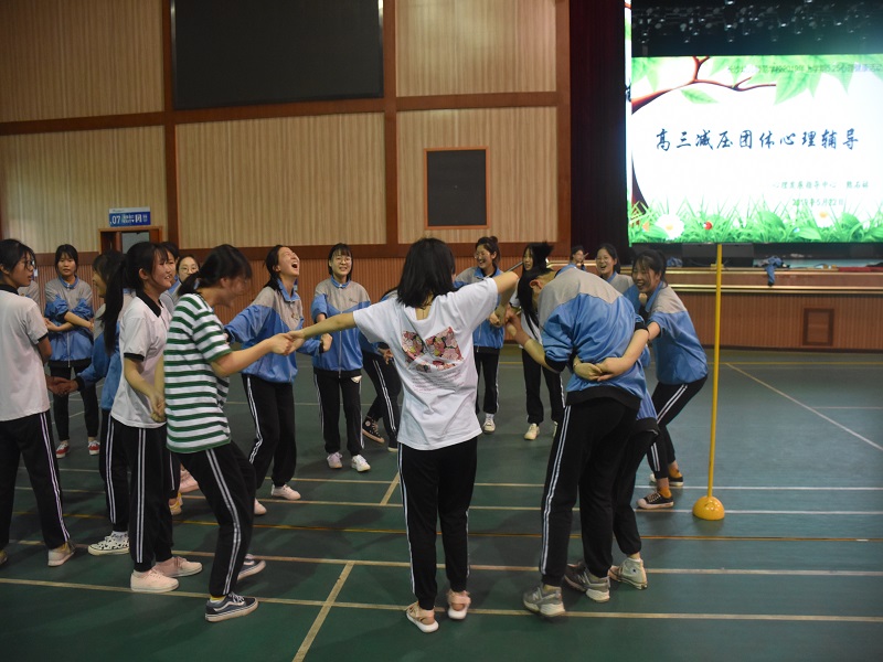 为鼓舞士气,激励高考斗志,引导学生释放压力,高效地开展高三学习,为高考保驾护航,2019年5月22日下午,我校开展了高三减压心理素质拓展团体活动。本次活动主训由我校国家二级心理咨询师、心理老师熊石林担任,辅训为心理老师周威和馨语社8名社员,50名高三学子参与活动,学生科副科长彭亮现场观摩和助阵。