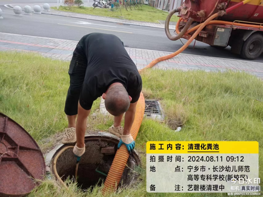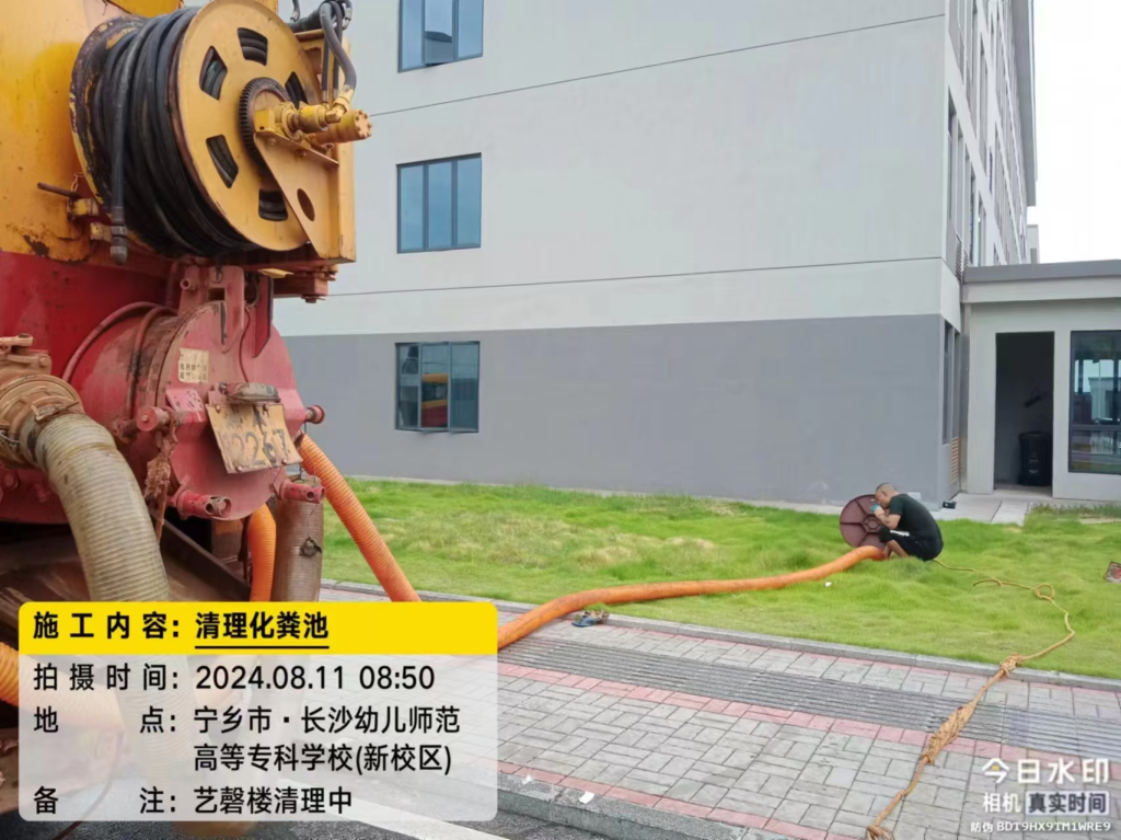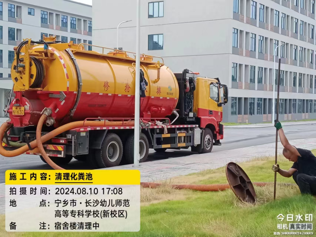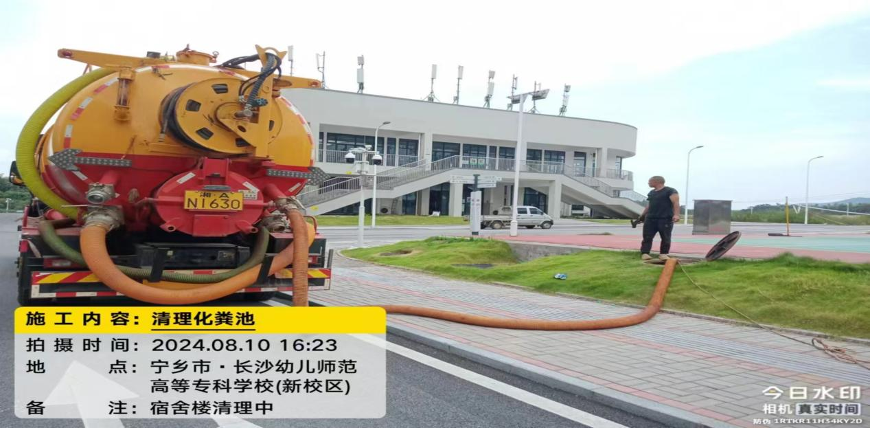 为全面提升校园环境质量,确保排水畅通与生活环境的整洁与安全。8月10日--11日期间,后勤处安排专人对化粪池进行专项清理工作,调集工作人员,周密部署,明确分工,对校园内每一处化粪池进行了全面、细致的排查及深度清理,有效解决了潜在向上冒水的堵塞隐患,为即将到来的新学期营造一个安全、整洁、舒适的校园环境。
