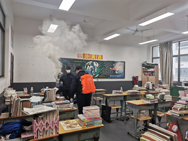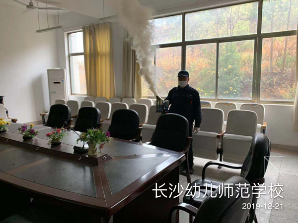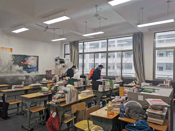 2019年12月21日,为有效预防传染病流行事件的发生,确保全校师生的身体健康,财务后勤科安排人员采用中药生态熏治(雾化、熏蒸)开展校园卫生消毒和疾病预防工作,第一轮消毒范围涉及德馨楼、厚德楼、启真楼的所有教室♥︎、厕所及公共场所。