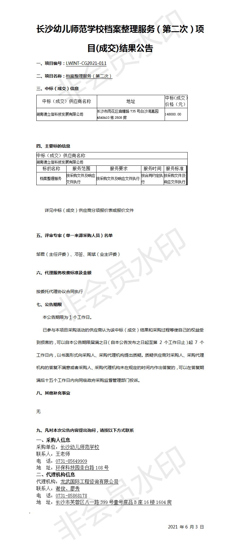 长沙幼儿师范学校档案整理服务(第二次)项目(成交)结果公告