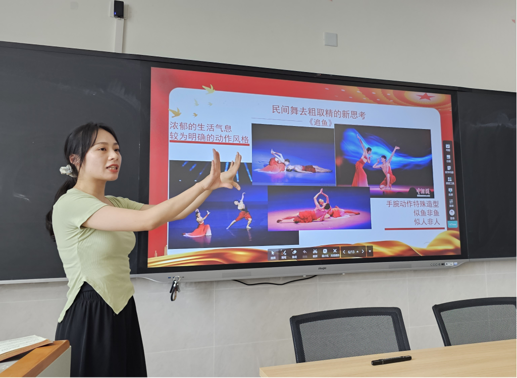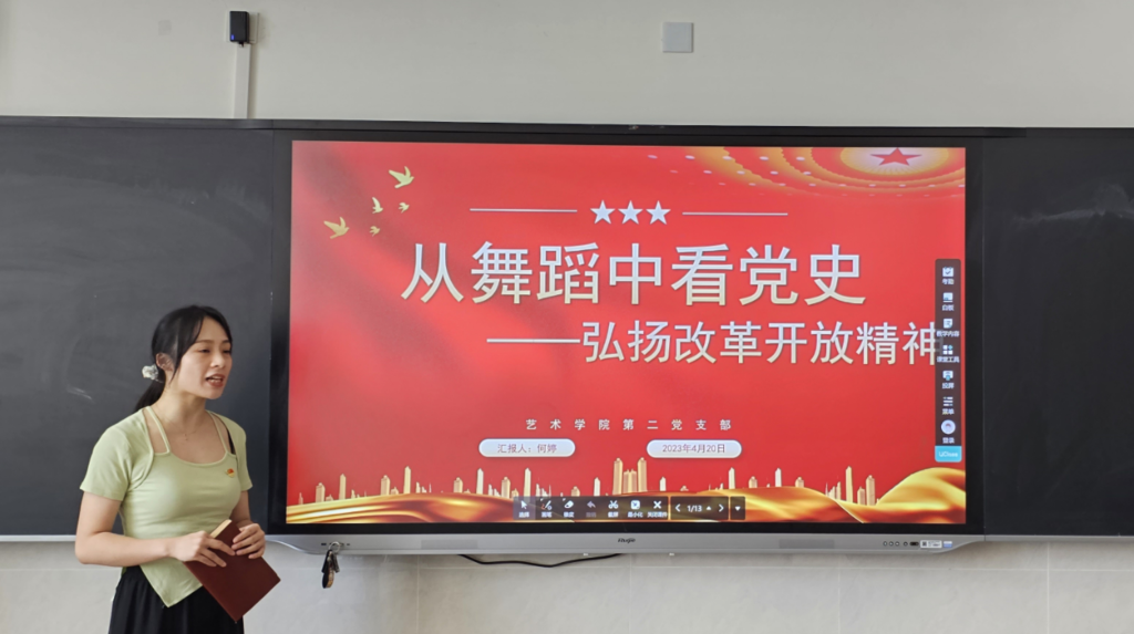为进一步贯彻习近平新时代中国特色社会主义思想,弘扬伟大建党精神赓续党的红色血脉,引导艺术学院全体党员将理论学习转化为指导教育教学工作的强大动力。4月20日下午,艺术学院全体党员在艺馨楼开展“从舞蹈中看党史”主题党日活动。艺术学院第二党支部书记何婷作为主讲人💠,将舞蹈作品的创作发展与中国近现代史中的改革开放精神相结合,从舞蹈中看党史➗,讲述改革开放时期的舞蹈发展历史。活动由艺术学院党总支书记伍莉主持。