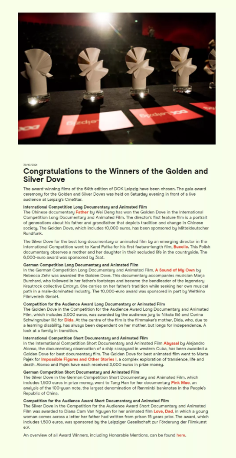2021年10月25日—10月31日第64届莱比锡国际纪录片与动画电影节(DOK Leipzig)如期举行,邓伟导演凭借纪录电影长片处女作Father在众多佳作中脱颖而出,一举囊括国际主竞赛、国际影评人奖、跨宗教评审团奖三项提名奖,并斩获国际长片主竞赛单元「金鸽奖」。