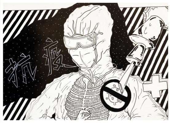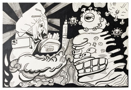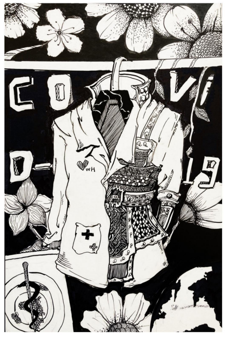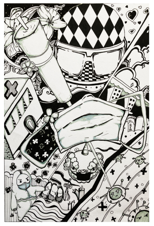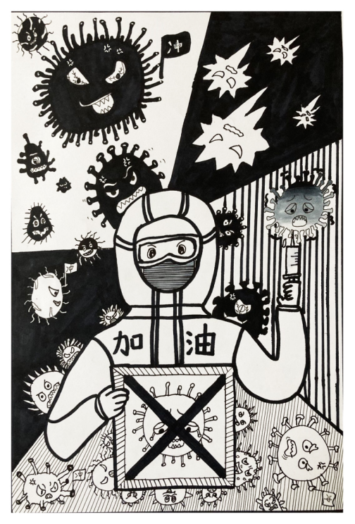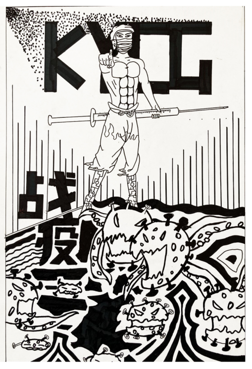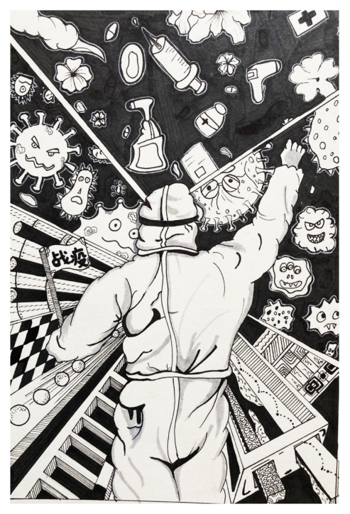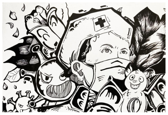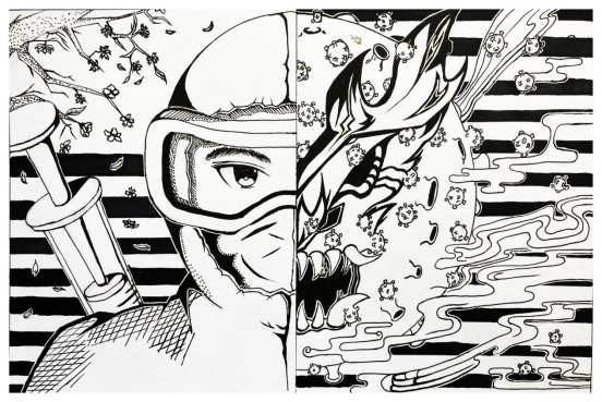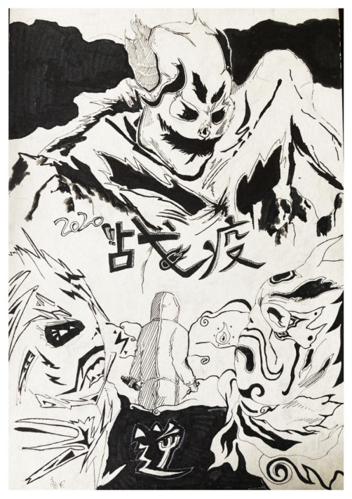 作品简介:左边是指在一线与新型冠状病毒抗战的医护人员,旁边的针管是他们的“武器”🧙🏼,樱花代表着2021年开年疫情短暂结束,武汉解封,樱花满城飘。说明医护人员抗击疫情的胜利,凯旋而归;右边则是由病毒聚集形成的一只怪物👋🏿,其灵感来源于山海经里的饕餮🥴,周围的祥云符号代表着新型冠状病毒逐渐消散⚪️。