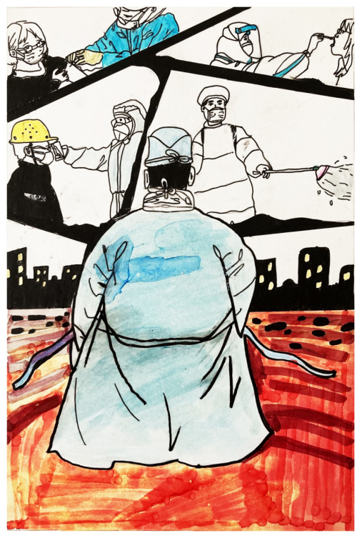 作品简介:白衣战士、防护镜、口罩、疫苗保护着我们不受疫病的侵扰,因此以他们为元素构成整个画面,构图为稳定的塔型,最上方白衣战士的背影以表达他们默默付出的精神🫄🏽。带好口罩,打好疫苗,是我们能为战疫做出的力所能的贡献。